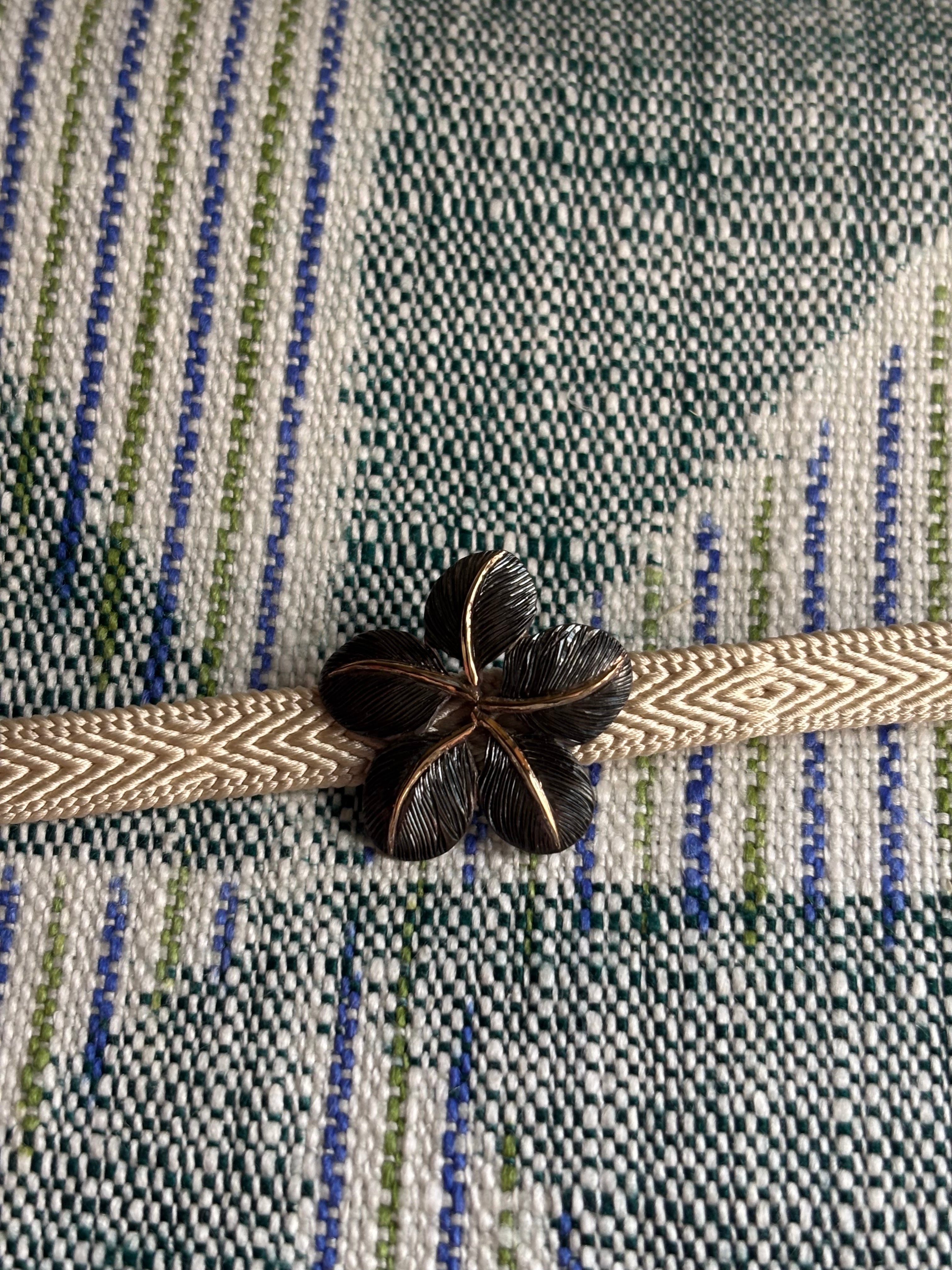 伝統的な彫金技法"毛彫り"による羽根のモチーフを得意とする秋濱さんの帯留めです。
