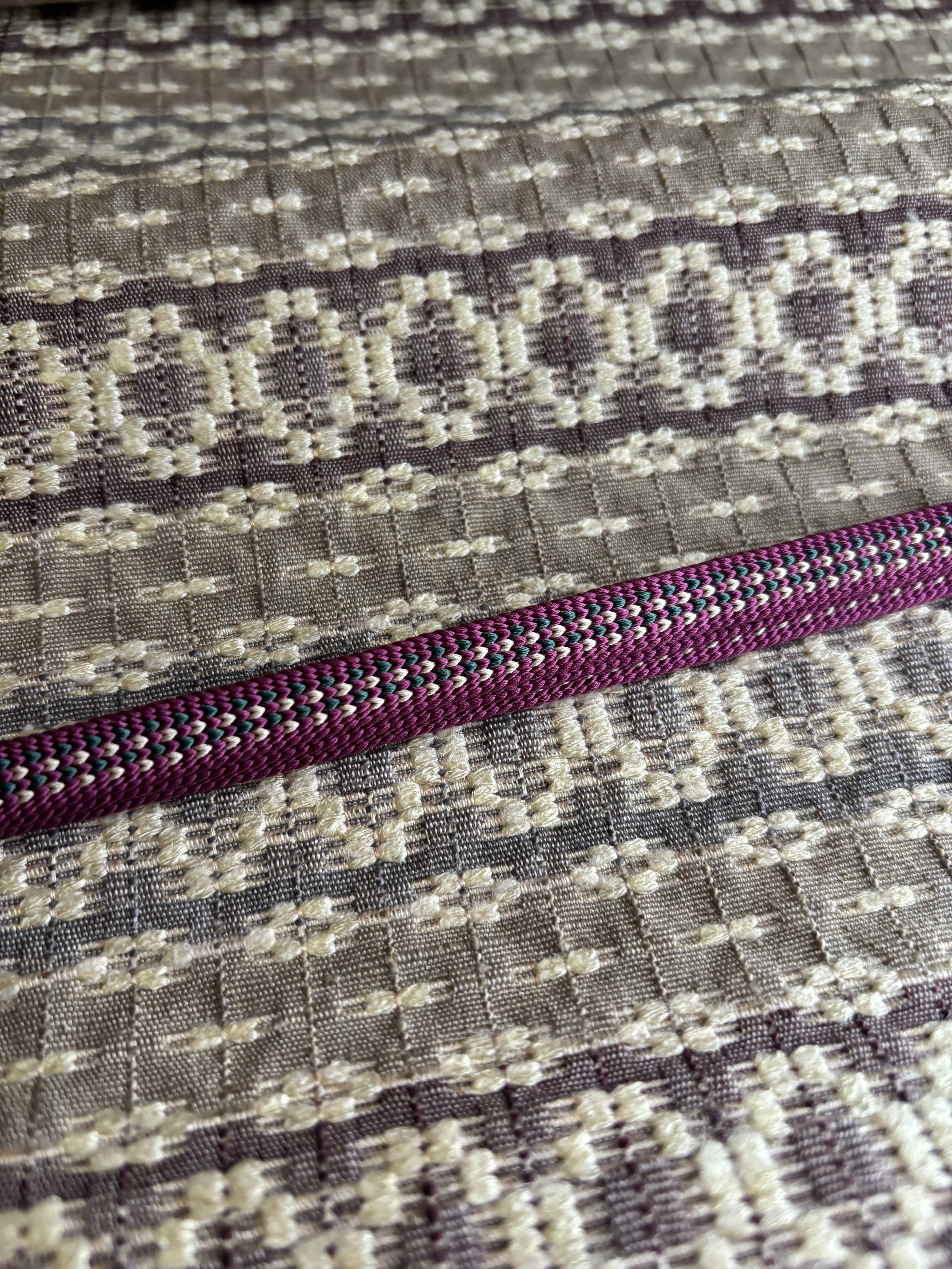 高尾山周辺で採取する植物を用いて絹糸を染め、綾竹組を主とした手組みで制作される三分紐は、帯留め合わせの幅を広げてくれます。