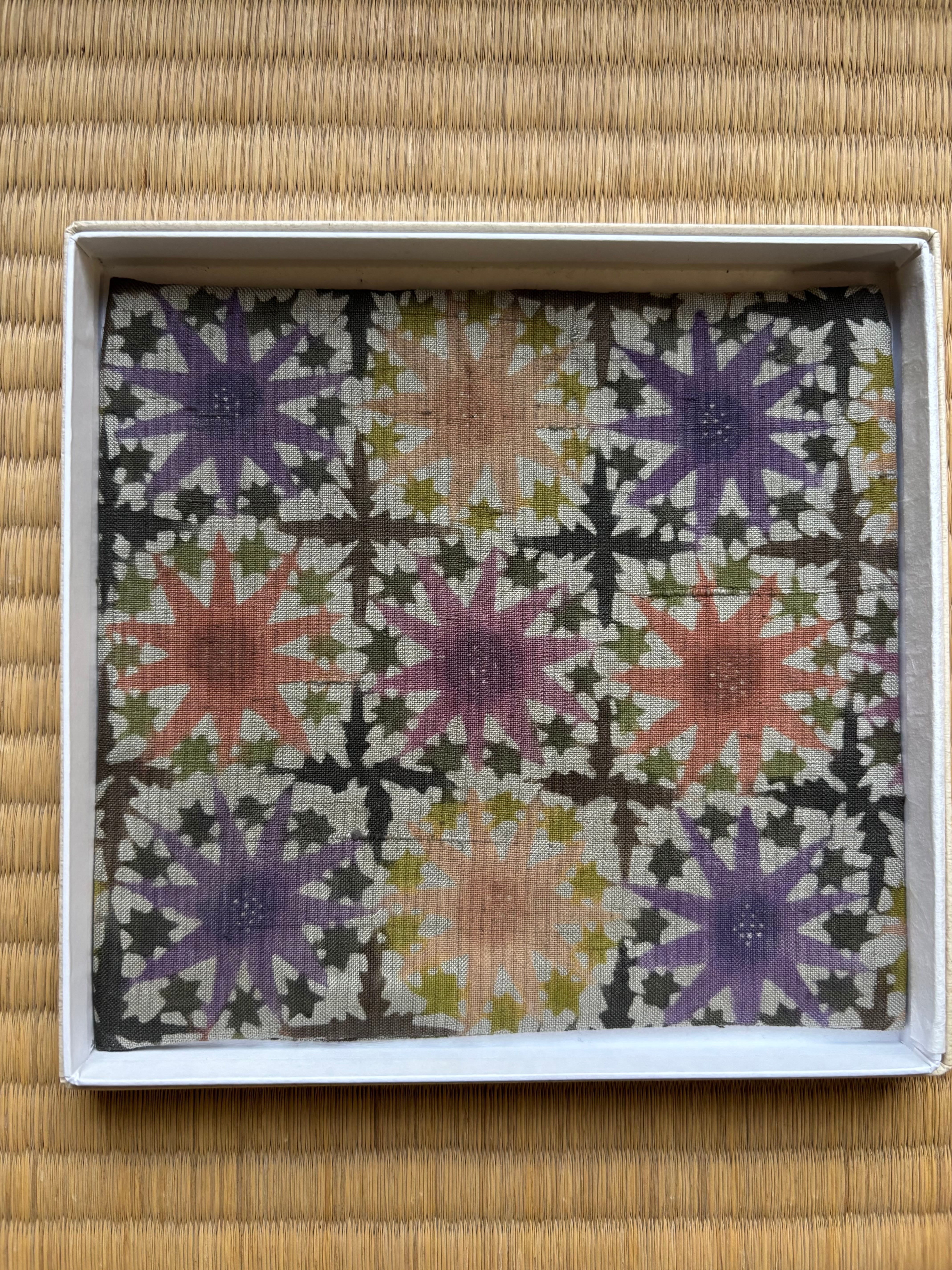 布(アジア各地の手織り布)、文様(ロマネスク文様や更紗などからインスパイア)、色(日本画で磨かれた色彩感覚)が響き合い、異国情緒を纏った津田さんの型染め布。